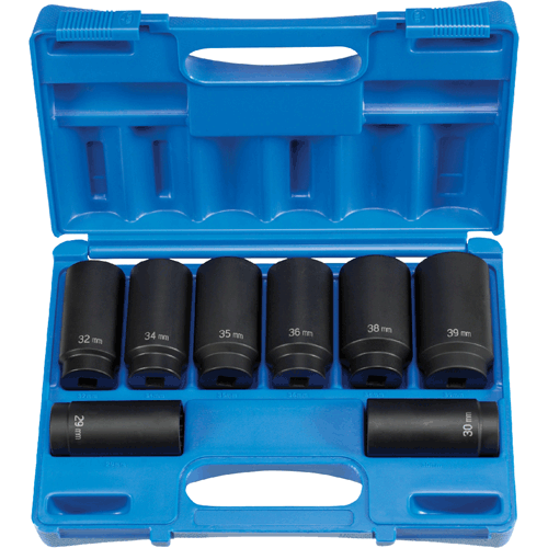 - Set contains eight (8) popular 12 point axle/spindle nut impact socket sizes