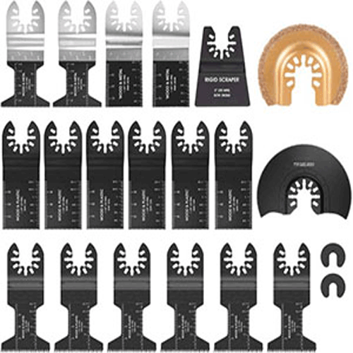 - Included Blades: (6) High carbon steel 1-3/8" (35mm) wood and plastic • (6) High carbon steel 1-3/4" (35mm) wood and plastic • (2) Stainless steel BI-Material 1-3/4" (44mm) wood and metal • (2) Stainless steel BI-Material 1-3/4" (44mm) wood and metal • (1) High carbon steel + Carbide grit 2-1/2" (65mm) grout • (1) Stainless steel scrapper 2" (50mm) rigid scraper • (1) High carbon steel 3-1/8" (80mm) wood, plastic and drywall • (2) Adaptor