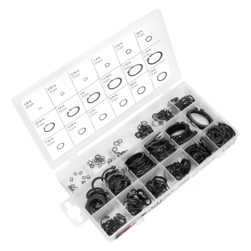 Contains 18 most popular sizes of snap rings packed in a convenient re-sealable plastic case.