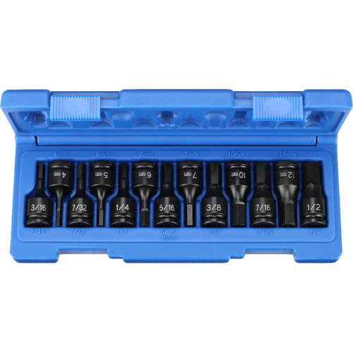 Set contains one piece impact hex drivers in sizes 3/16'' to 1/2'' and 4mm to 12mm