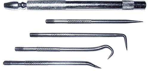 This four way repair kit has a knurled aluminum handle with four tempered steel picks. Comes in a plastic pouch.