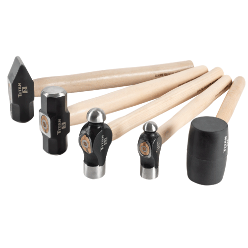 Includes 16 oz and 32 oz ball pein hammers, 32 oz rubber mallet, 3 lb sledge hammer, 3 lb cross pein hammer