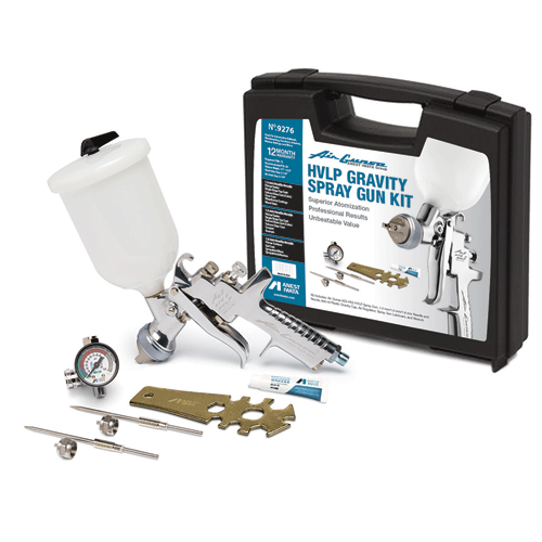 - Kit includes one full-size AZ3-HV2 HVLP spray gun, one 600ml plastic gravity cup, one each 1.3 mm/ 1.5 mm/ 1.8 mm needle/nozzle set, air regulator, wrench, and gun lubricant